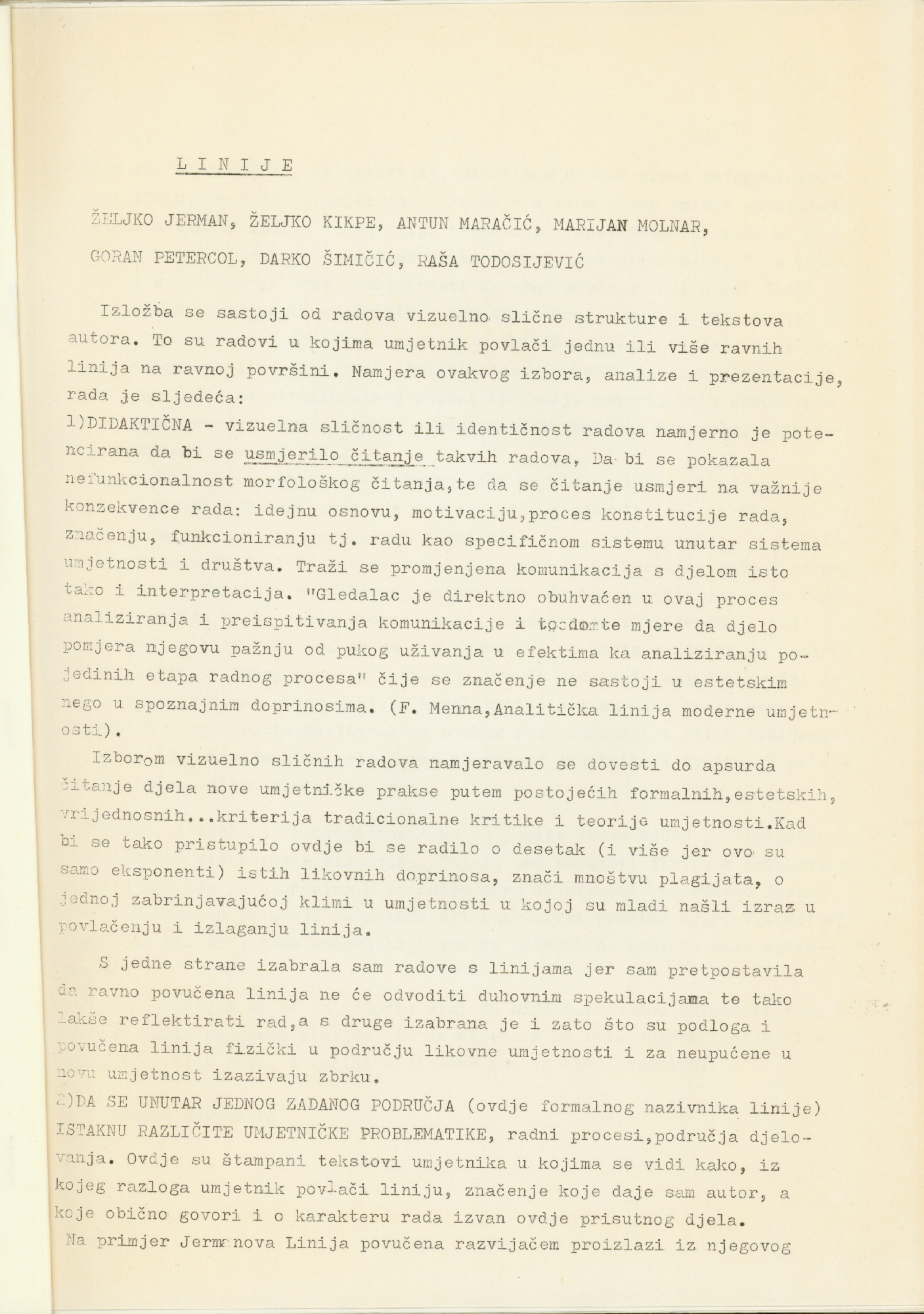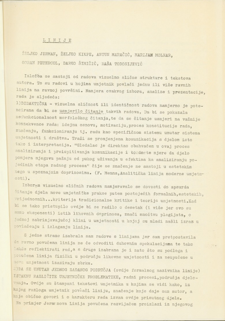 katalog izložbe "Linije" u Podroom, Mesnička 12, Zagreb, Branka Stipančić; Željko Kipke, Željko Jerman, Antun Maračić, Marijan Molnar, Goran Petrecol, Raša Todosijević, Darko Šimičić