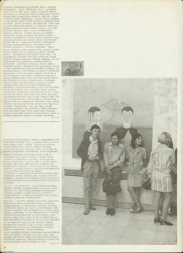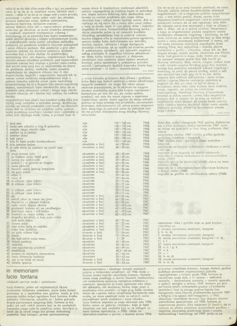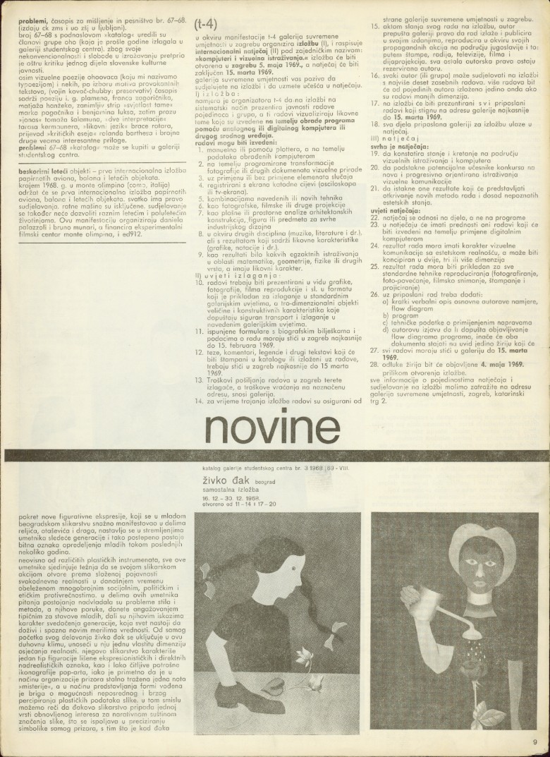 University Student Centre, Student Centre Gallery, Zagreb, Savska 25; Poster and catalogue : B. Bućan, photography: V. Jakolić; press: grafičko likovni servis SCSC; 500 copies printed; Artists: Živo Đak, Ivan Slamnig; Texts: Ješa Denegri, Slobodan Ristić, Irina Subotić, Nikola Kusovac, Biljana Tomić