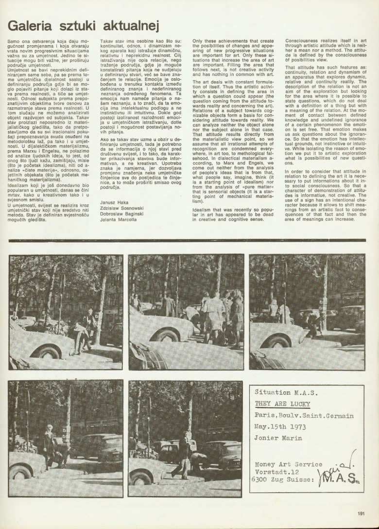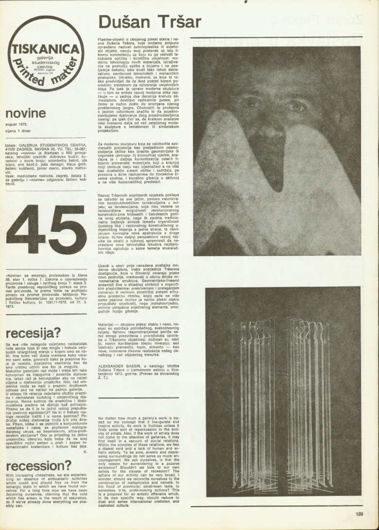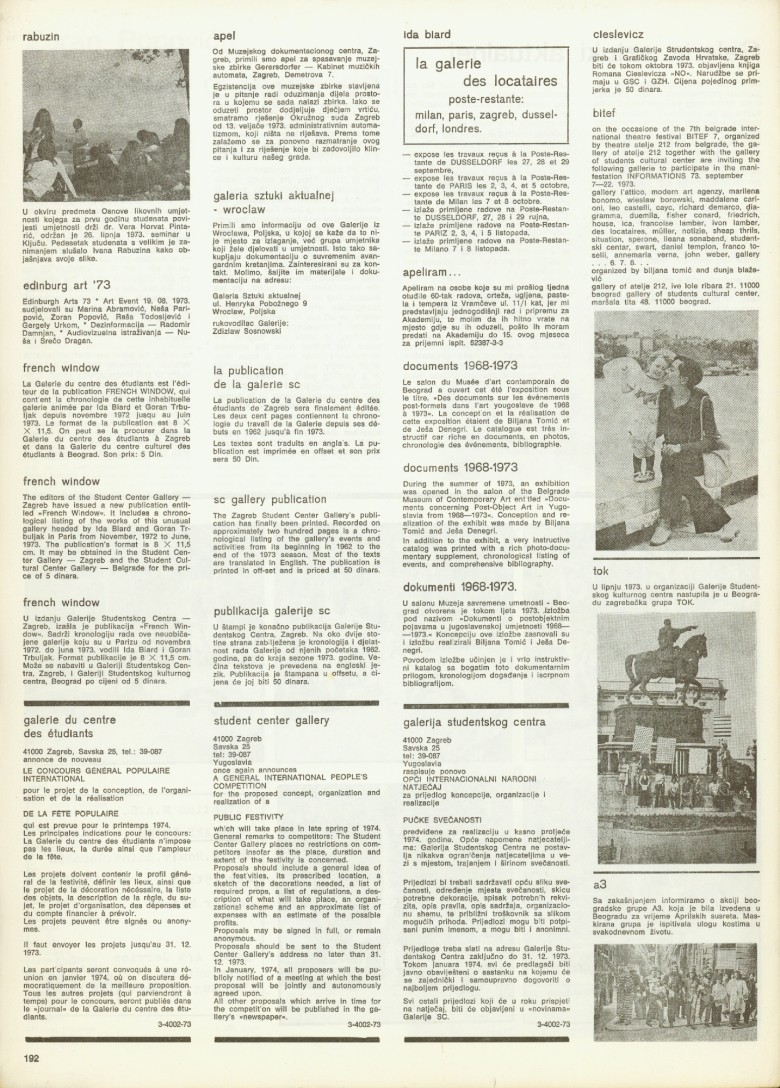 price 1 dinar; publisher: Student Centre Gallery, Zagreb, Savska 25, University Student Centre in Zagreb; technical editor: Dubravko Budić; 600 copies printed; press: Medicinska naklada, Zagreb, Šalata 3; for the newspaper and gallery: Želimir Koščević; collaborators: Balint Szombathy, Slavko Matković, Ida Biard, Ann Borčić, Ješa Denegri, Klaus Groh, Želimir Koščević, Jonier Marin; Dušan Tršar, Zoran Popović, Annette Messager, Janus Haka, Zdzislaw Sosnowski, Dobroslav Baginski, Jolanta Marcolla