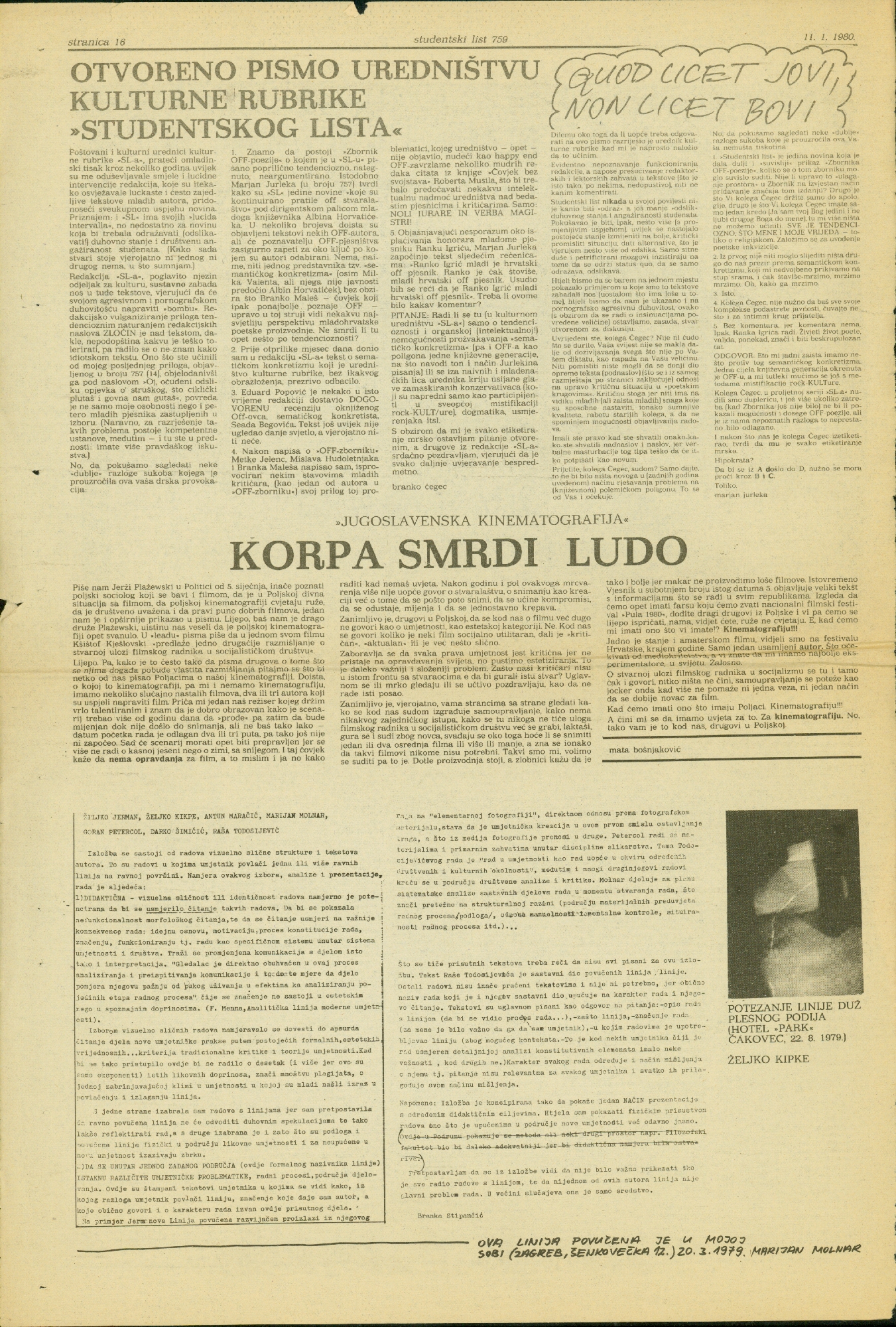 Article in Studentski list no. 759 by Branka Stipančić, page 16; Željko Jerman, Željko Kipke, Antun Maračić, Goran Petercol, Marijan Molnar, Darko Šimičić, Raša Todosijević