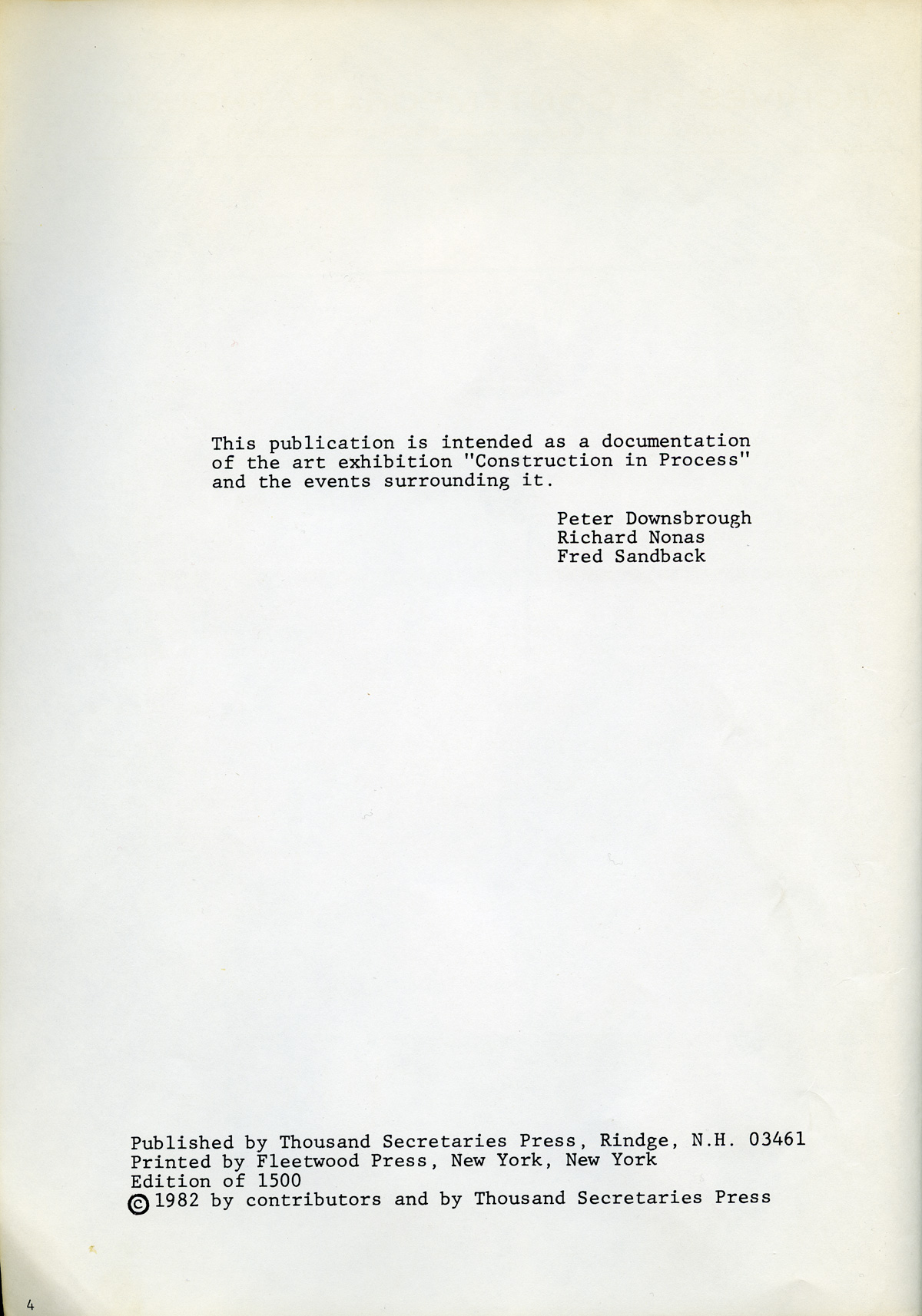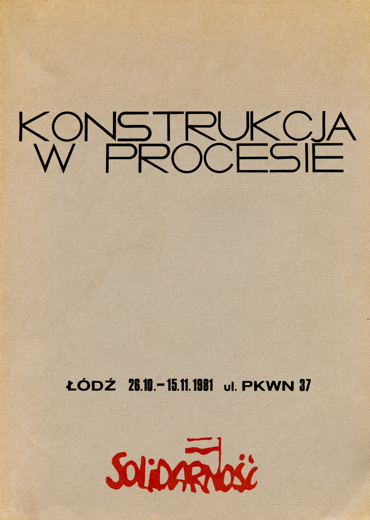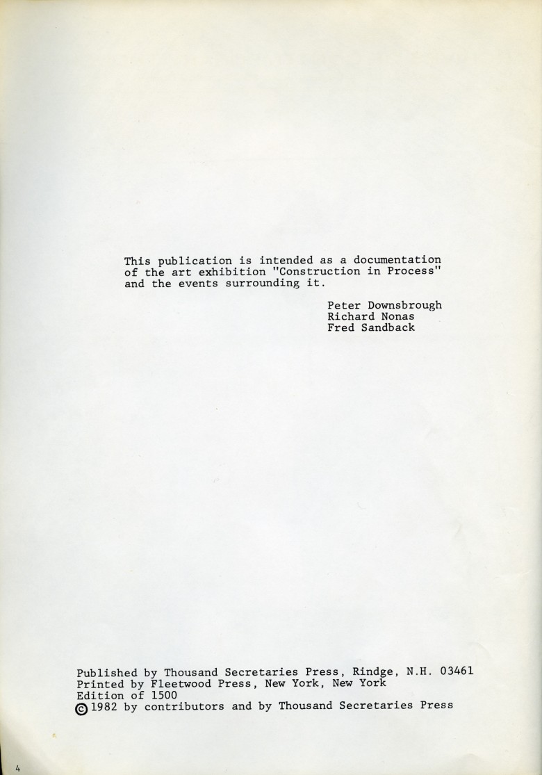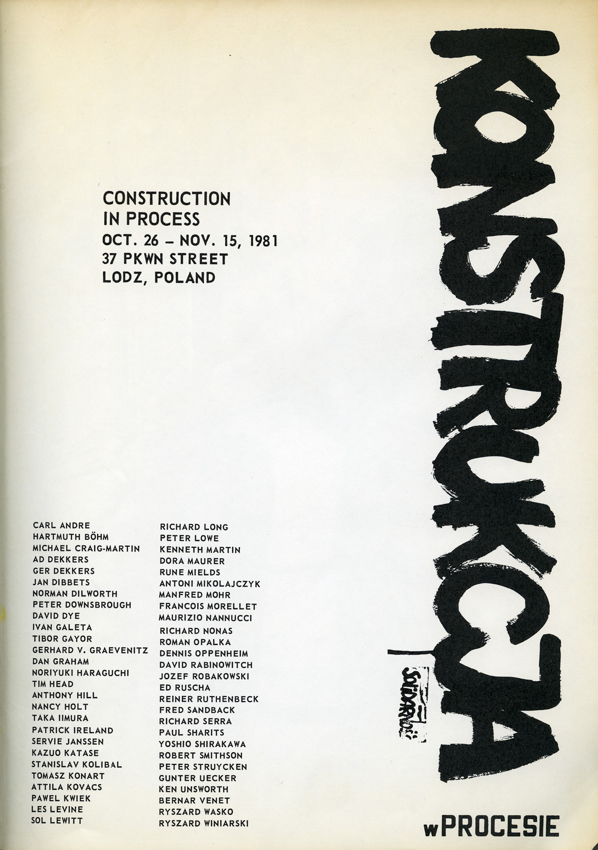"Constrution in process" catalogue, Łódź 1981 (Participants: CARL ANDRE, HARTMUTH BÖHM, MICHAEL CRAIG-MARTIN, AD DEKKERS, GER DEKKERS, JAN DIBBETS, NORMAN DILWORTH, PETER DOWNSBROUGH, DAVID DYE, IVAN GAL ETA, TIBOR GAYOR, GERHARD V. GRAEVENITZ, DAN GRAHAM, NORIYUKI HARAGUCHI, TIM HEAD, ANTHONY HILL, NANCY HOLT, TAKA IIMURA, PATRICK IRELAND, SER VIE JANSSEN, KAZUO KATASE, STANISLAV KOLIBAL , TOMASZ KONART, ATTILA KOVACS, PAWEL KWIEK, LES LEVINE, SOL LEWITT, RICHARD LONG, PETER LOWE, KENNETH MARTIN, DORA MAURER, RUNE MIELDS, ANTONI MIKOLAJCZYK, MANFRED MOHR, FRANCOIS MORELLET, MAURIZIO NANNUCCI, RICHARD NONAS, ROMAN OPALKA, DENNIS OPPENHEIM, DAVID RABINOWITCH, JOZEF ROBAKOWSKI, ED RUSCHA, REINER RUTHENBECK, FRED SANDBACK, RICHARD SERRA, PAUL SHARITS, YOSHIO SHIRAKAWA, ROBERT SMITHSON, PETER STRUYCKEN, GUNTER UECKER, KEN UNSWORTH, BERNAR VENET, RYSZARD WASKO, RYSZARD WINIARSKI)