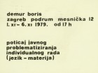 Podroom was largely a meeting point for the pioneers of new artistic practice, which intended it to function not only as a gallery, but also as a place that would be dominated by the hitherto non-existing or long-forgotten forms of communication between artists, such as open debates, dialogue, publishing activity, and organized struggle for the improvement of the social and economic position of artists. In 1979, they proposed an “Agreement on the Conditions of Presenting Works of Art in Public,” in which they defined the recent problems related to art presentation, demanding a better position for the artist with regard to cultural institutions. With their agreement, they indicated the need of financially evaluating art independently of the market and pointed out the problem of aesthetic and artistic values as predetermined by the dominant institutions. Representatives of new artistic practice regularly produced artworks that negated the classical form of gallery exhibition, encouraging the creation of alternative spaces such as Podroom. Artists gathering in this venue included Boris Demur, Vladimir Dodig Trokut, Ivan Dorogi, Tomislav Gotovac, Sanja Iveković, Željko Jerman, Željko Kipke, Antun Maračić, Vlado Martek, Dalibor Martinis, Marijan Molnar, Goran Petercol, Rajko Radovanović, Mladen Stilinović, Sven Stilinović, Goran Trbuljak, Fedor Vučemilović, and Mirjana Zorić. They were independent artists or members of other art groups, and they used Podroom to promulgate their ideas, exhibit their artworks, and engage in debates about art and the position of artists.