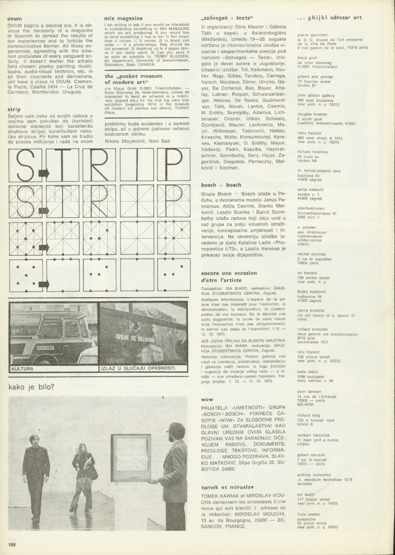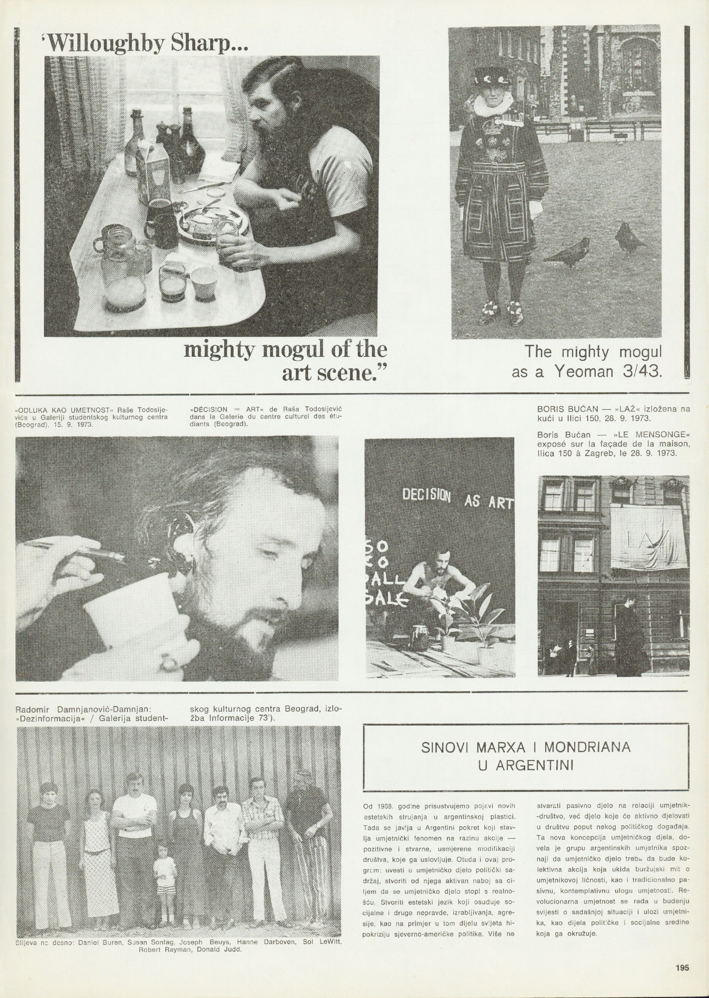 Dubravko Budić, Boris Bućan, Petar Dabac, Željko Stojanović, Želimir Koščević, Balint Szombathy, Ida Biard, Cadere, Radomir Damjanović-Damnjan, Albert Goldstein, Sarkis, Willghouby Sharp, Nikola Stojanović; Daniel Buren, Susan Sontag, Joseph Beuys, Hanne Darboven, Sol leWitt, Robert Rayman, Donald Judd, Daniel Buren