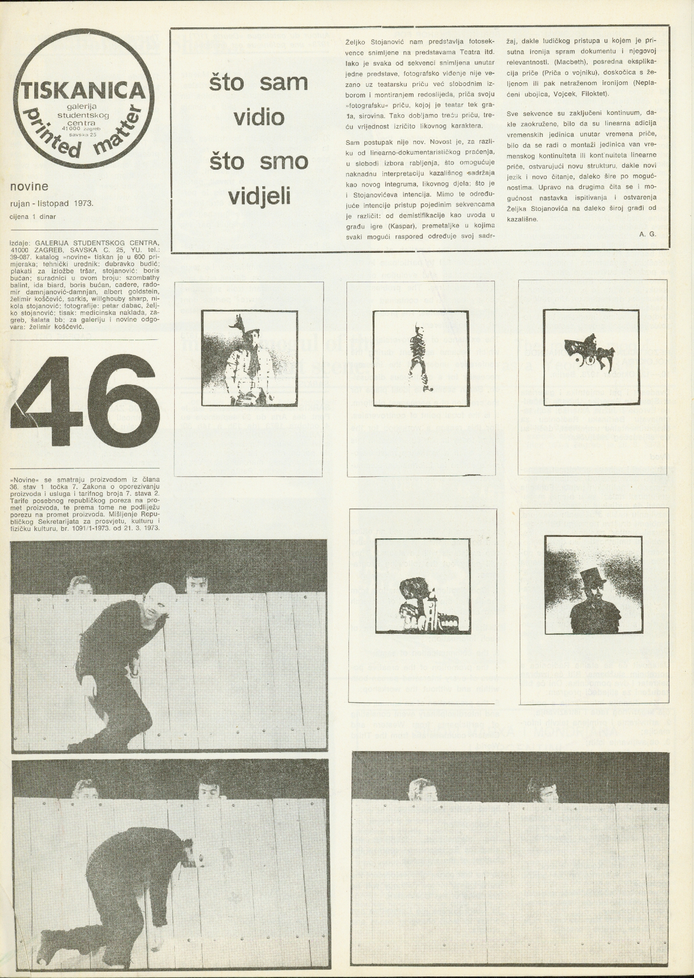 cijena 1 dinar; Novine izdaje: Galerija Studentskog centra, Zagreb, Savska 25, Studentski centar Sveučilišta u Zagrebu; tehnički urednik: Dubravko Budić; plakat izložbe Tršar, Stojanović: Boris Bućan; Fotografije: Petar Dabac, Željko Stojanović; novine su tiskane u 600 primjeraka; tisak: Medicinska naklada, Zagreb, Šalata bb; za novine i galeriju odgovara: Želimir Koščević; suradnici: Balint Szombathy, Ida Biard, Želimir Koščević, Boris Bućan, Cadere, Radomir Damjanović-Damnjan, Albert Goldstein, Sarkis, Willghouby Sharp, Nikola Stojanović; Daniel Buren, Susan Sontag, Joseph Beuys, Hanne Darboven, Sol leWitt, Robert Rayman, Donald Judd