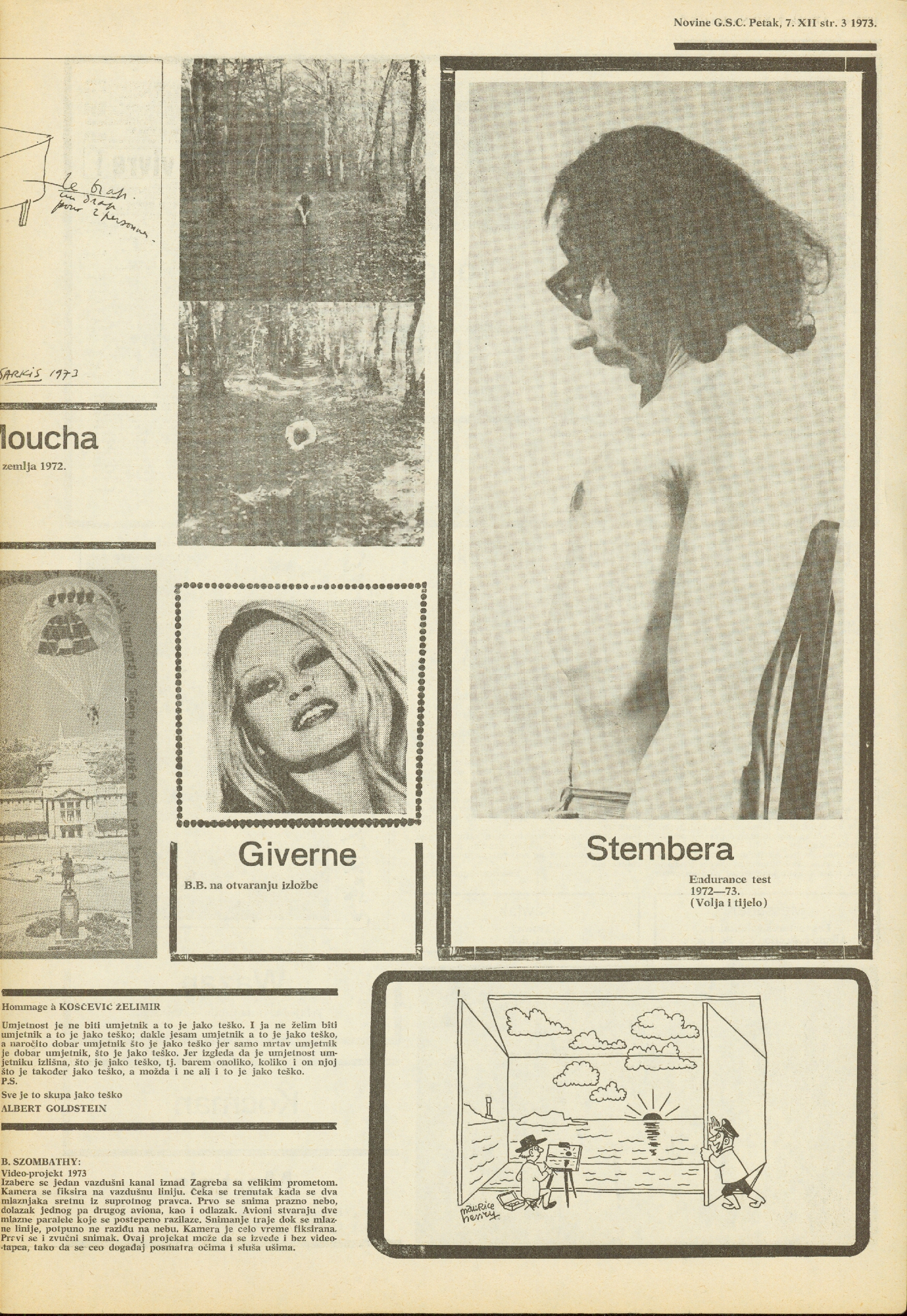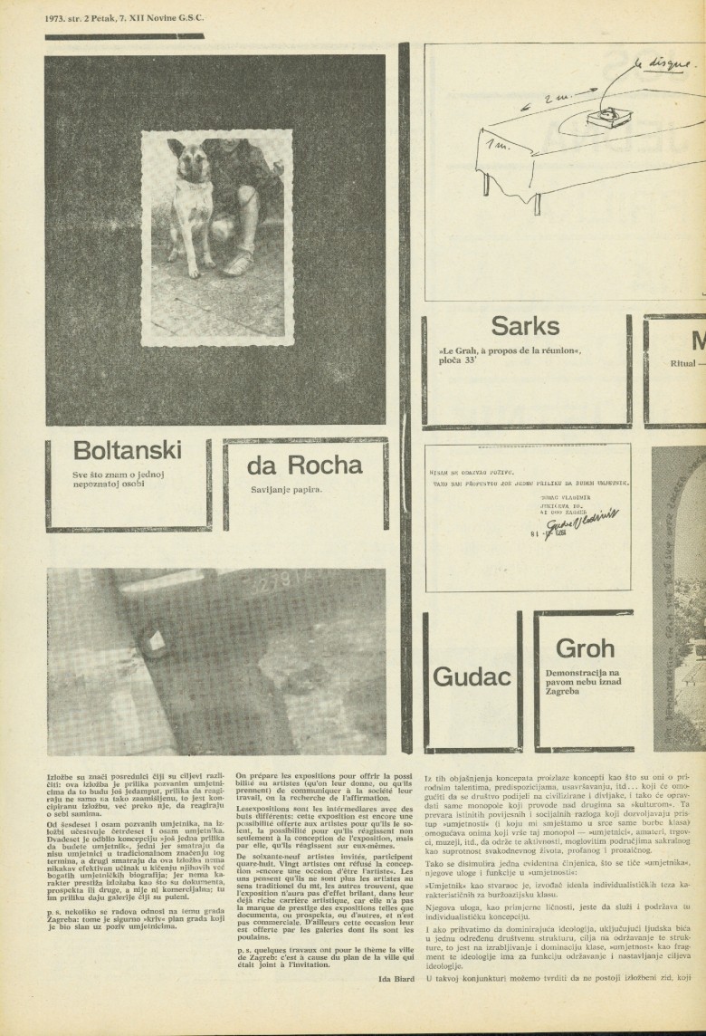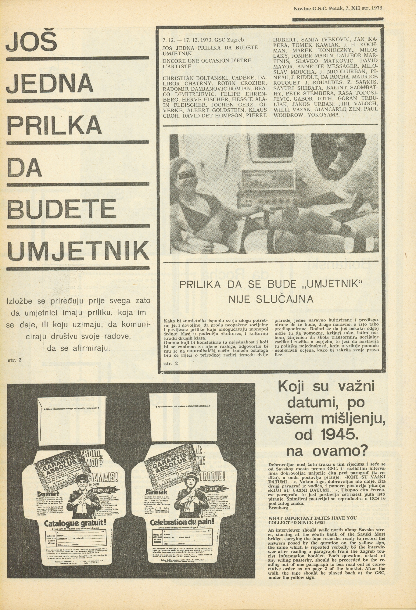 Newspapers of Student Centre Gallery, exhibition "Još jedna prilika da budete umjetnik": Christian Boltanski, Cadere, Dalibor Chartrny, Robin Crozier, Radomir Damjanović-Damnjan, Braco Dimitrijević, Felipe Ehrenberg, Herve Fischer, Hessie Alain Fleischer, Jochen Gerz, Giverne, Albert Goldstein, Klaus Groh, David Det Hompson, Pierre Hubert, Sanja Iveković, Jan Kapiera, Tomek Kawiak, J.H. Kochman, Marek Konieczny, Milos Laky, Jonier Marin, Dalibor Martinis, Slavko Matković, David Mayor, Annette Messagfer, Milovan Moucha, J. Nicod-Urban, Pineau, J. Riddle, Da Rocha, Maurice Rouquet, J. Roualdes, Sarkis, Sayuri Shibata, Balint Szombathy, peter Štembera, Raša Todosijević, Gabor Toth, Goran trbuljak, Janos Urban, Jiri Valoch, Willi Vazan, Giancarlo Zen, Paul Woodrow, Yokoyama; Ida Biard, Albert Goldstein