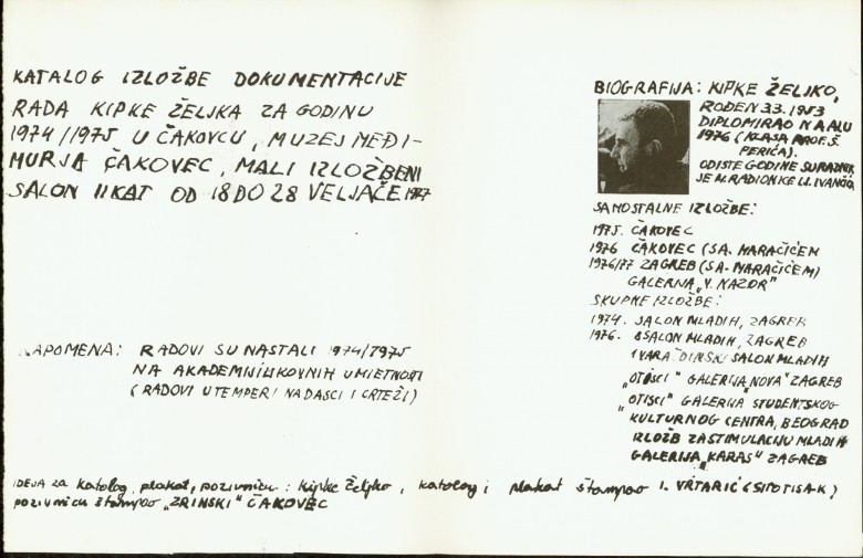 catalogue of the exhibition of documentation of work of Željko Kipke fot the year 1974/1975 in Čakovec