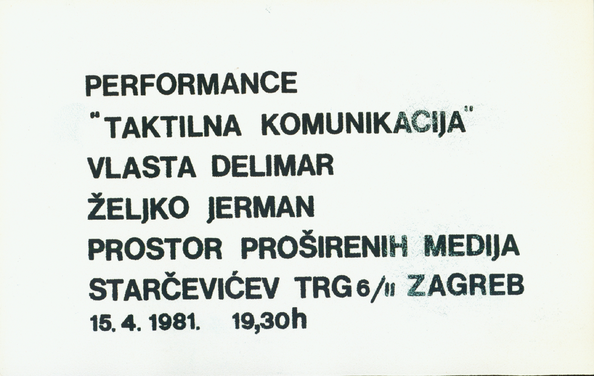 invitation card for the performance "Taktilna komunikacija" by Vlasta Delimar and Željko Jerman in PM