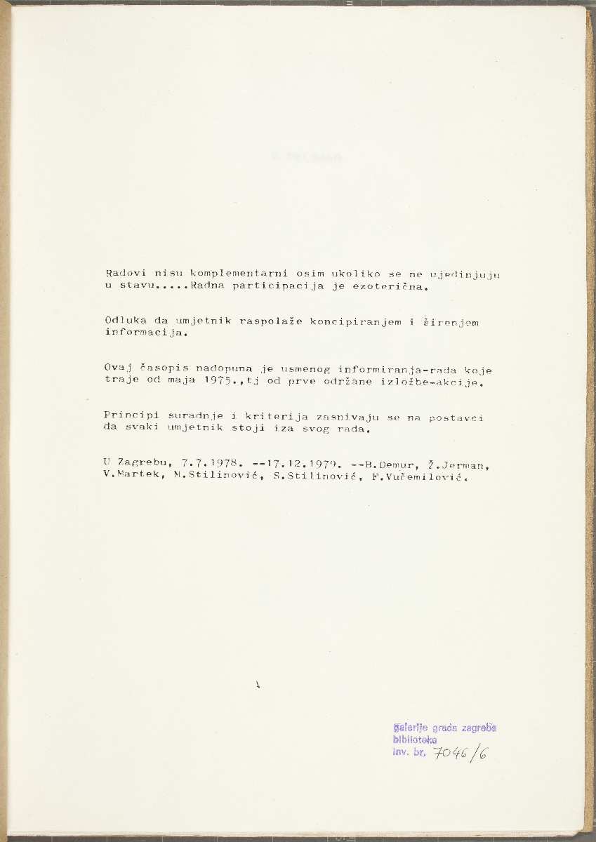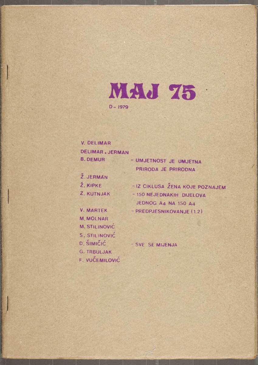 Maj 75, broj D, 1979; Vlasta Delimar, Željko Jerman, Boris Demur, Željko Kipke, Zlatko Kutnjak, Vlado Martek, Marijan Molnar, Mladen Stilinović, Sven Stilinović, Goran Trbuljak, Fedor Vučemilović