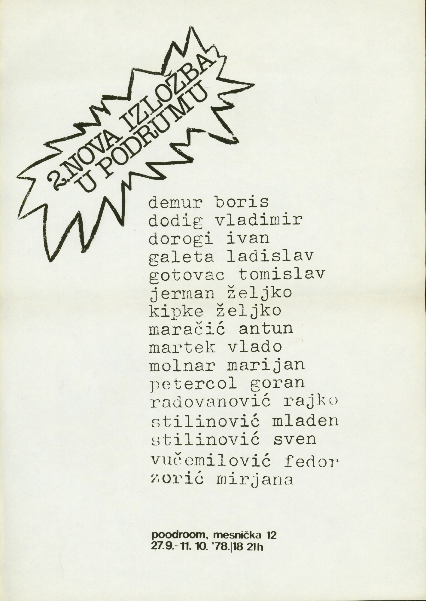 poster izložbe "2. Nova izložba u Podrumu" at Podroom, Mesnička 12, Zagreb; Goran Petercol, Ladislav Galeta, Boris Demur, Željko Jerman, Vlado Martek, Fedor Vučemilović, Željko Kipke, Marijan Molnar, Tomislav Gotovac, Antun Maračić, Ivan Dorogi, Mirjana Zorić, Vladimir Dodig Trokut, Rajko Radovanović, Mladen Stilinović, Sven Stilinović