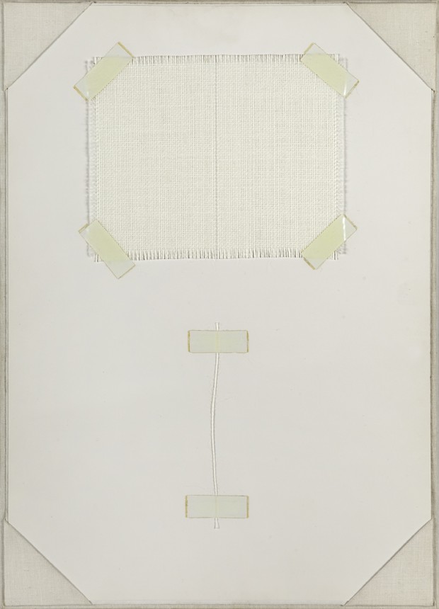 Beli konac zalepljen belom trakom za beli karton