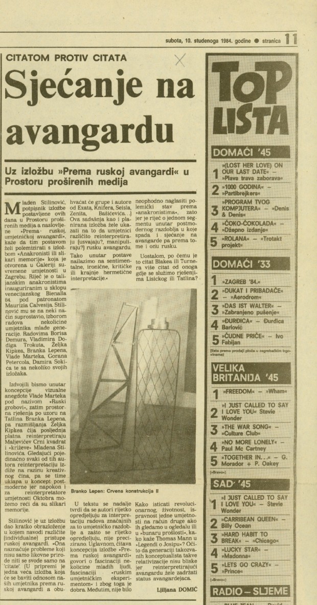 članak "Sjećanje na avangardu" Ljiljane Domić u Vjesniku, 10 studeni, 1984, stranica 11