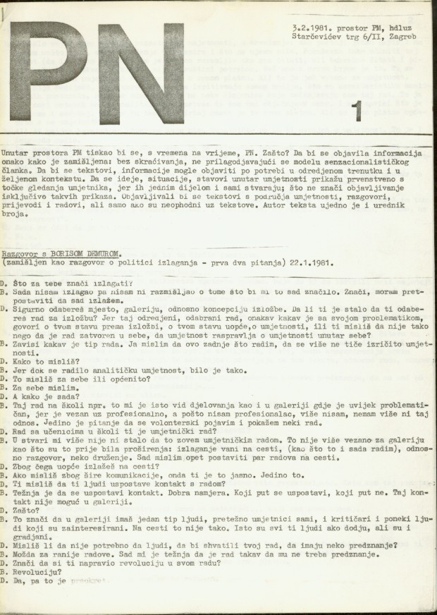 novine "Proširene novine" (PN), broj 1, prostor PM. HDLUZ, Stačevićev trg 6/II, Zagreb; intervju Dubravke Rakoci s Borisom Demurom; text "O prostoru PM" Gorana Petercola; reprodukcija radova: Boris Demur