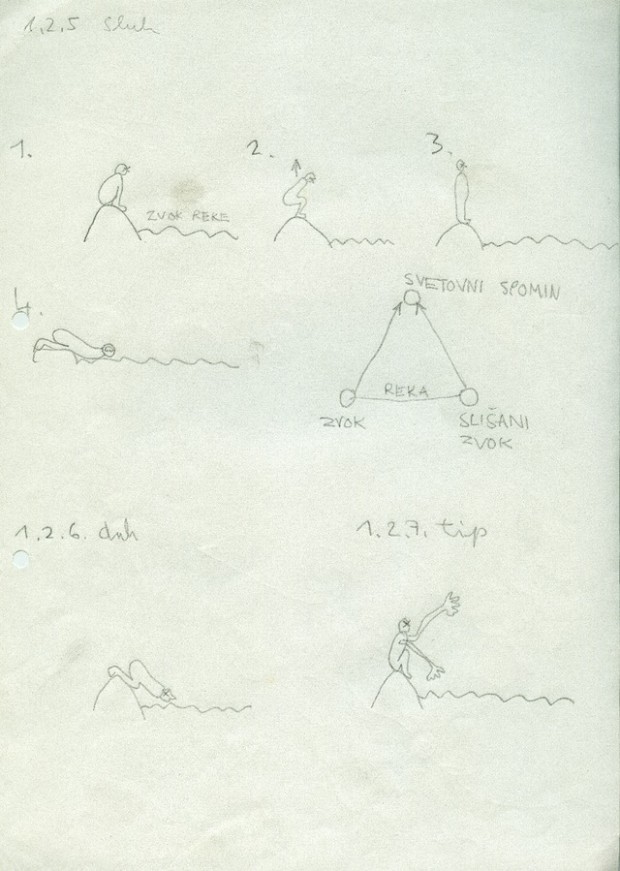 Skupina OHO je poleti 1970 razvila novo obliko dela imenovanega grupno šolanje. Poleg šolanja v dolini Zarice, Sorškega polja, tudi v vasi Čezsoča v zahodni Sloveniji. V času šolanja v Čezsoči so člani Skupine OHO skušali združiti umetnost z vsemi aspekti življenja, kar je razvidno iz uvodnega zapisa na prvem listu. Ta strukturira dan po točkah od jutranjega zbujanja (ob 4.37h, ko je vzšlo sonce) do spanja - grupno aktivni del in grupno pasivni del - ter jih poveže v ritualni koncept umetnosti in življenja. Vaje so se delile na svetni in nadsvetni pojav grupe. Člani so na grupnem šolanju izvajali vaje povezane s čutili, hojo, dihanjem, vadili so se npr. v ukrivljenem gledanju (7), imeli vid za idealno oporo subjektivnega ravnovesja (2), strukturirali pa so tudi vsakdanje stvari kot so umivanje (8), hrana (11), telesne vaje, hoja (12), ki so jo delili na koncentrativno in ritmično, vaje pa so uvrščali pod kategorijo grupnega potovanja skupine. Delili so jo na svetniško hojo, hojo po stopnicah, hojo ob glasbi, hojo z vodstvom (17). V šolanju Čezsočo so člani za izrazno sredstvo uporabljali glasbo, risbo, ohranile pa so se tudi fotografije posameznih projektov. V tem času je nastala tudi znana fotografija, ki Ohojevce prikazuje med eno izmed njihovih akcij, ko v vrsti, povezani s palico, drug za drugim sledijo skozi pokrajino s prevezanimi očmi (skici 13 in 18). Zapise o grupnem šolanju Čezsočo dobro povzame misel: ritem je osnova rituala, disciplina je osnova ritma (20), ki so jo upoštevali udeleženci pri iskanju harmoničnega ravnovesja in relacijskih vzorcev med jazom in svetom.