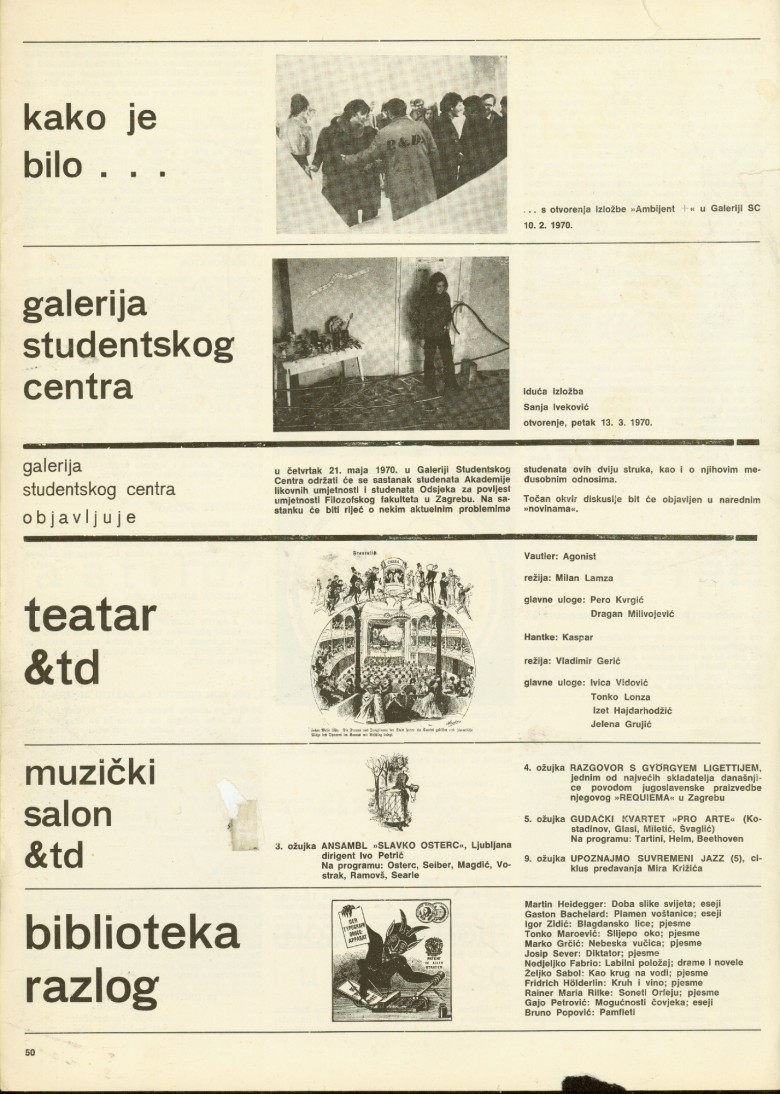 Studenstki centar Sveučilišta, Galerija studentskog centra, Zagreb, Savska 25; Plakat B. Bućan, Katalog D. Tomičić; katalog štampan u 500 primjeraka; tisak: Medicinska naklada, Zagreb, Šalata 3; za galeriju i katalog: Želimir Koščević; Zmago Jeraj, Remigije Jamberščak za Društvo amatera pronalazača iz Zapruđa