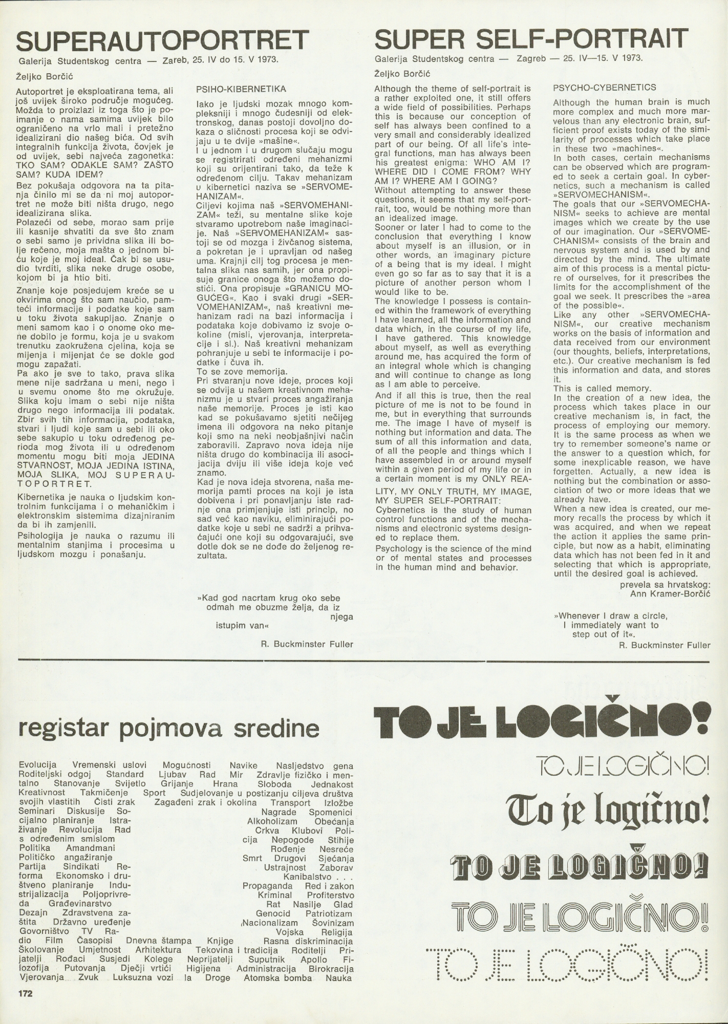 cijena 1 ND; Novine izdaje: Galerija Studentskog centra, Zagreb, Savska 25, Studentski centar Sveučilišta u Zagrebu; dizajn novina Dubravko Budić; plakat za izložbu "Superautoportret": Željko Borčić; fotografije: P. Dabac, E. Midžić; novine su tiskane u 600 primjeraka; tisak: Medicinska naklada, Zagreb, Šalata 3; za novine i galeriju odgovara: Želimir Koščević; suradnici: Balint Szombathy, Zvonko Maković, Željko Borčić, Marijan Tršar, Slavko Matković, Marijan Susovski; Zvonko Stojević, Land Art, rasponi 73, Jorge Glusberg, Milomir Milo Jevtić