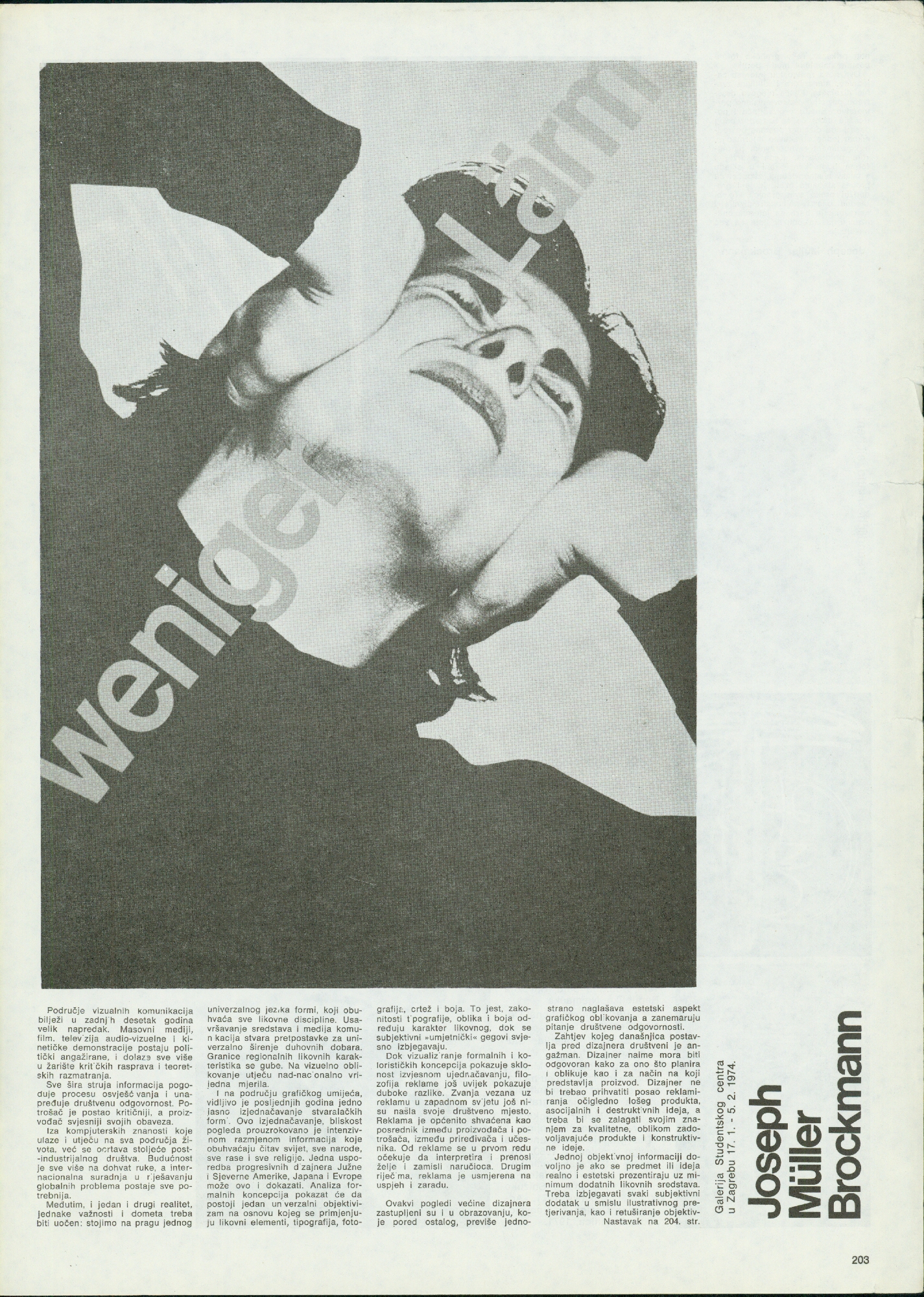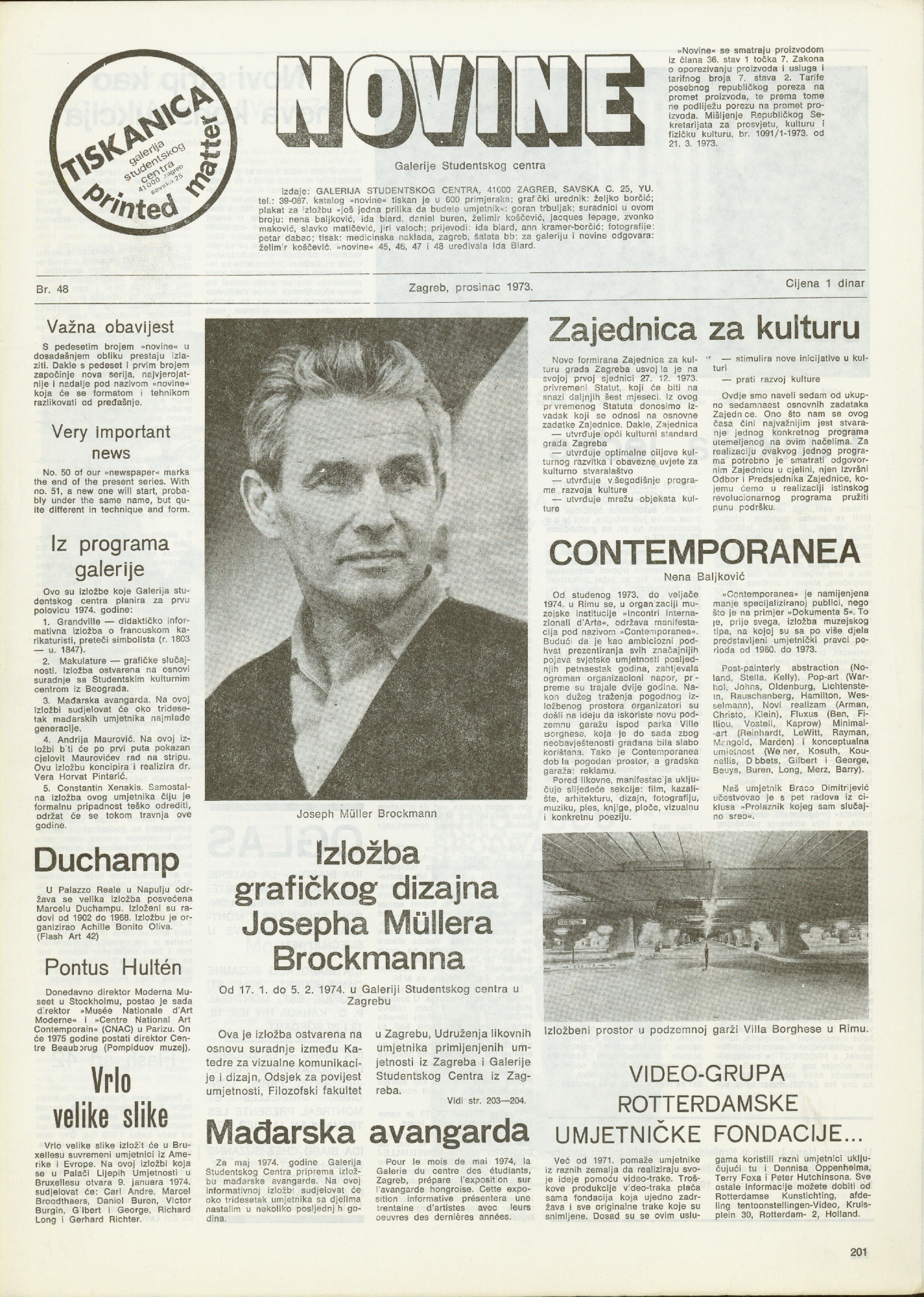 cijena 1 dinar; Novine izdaje: Galerija Studentskog centra, Zagreb, Savska 25, Studentski centar Sveučilišta u Zagrebu; tehnički urednik: Željko Borčić; plakat za izložbu "Još jedna prilika da budete umjetnik": Goran Trbuljak; Fotografije: Petar Dabac; novine su tiskane u 600 primjeraka; tisak: Medicinska naklada, Zagreb, Šalata 3; za novine i galeriju odgovara: Želimir Koščević; suradnici: Nena Baljković, Ida Biard, Daniel Buren, Želimir Koščević, Jacques Lepage, Zvonko Maković, Slavko Matković, Jiri Valoch, projevodi: Ida Biard, Ann Kramer-Borčić; novine 45,46,47 i 48 uređivala Ida Biard;Joseph Müller Brockmann, Marcel Duchamp, Vladimir Gudac, Miro Vuco, Davor Matičević, Roman Cieslewicz, Ben Vautier