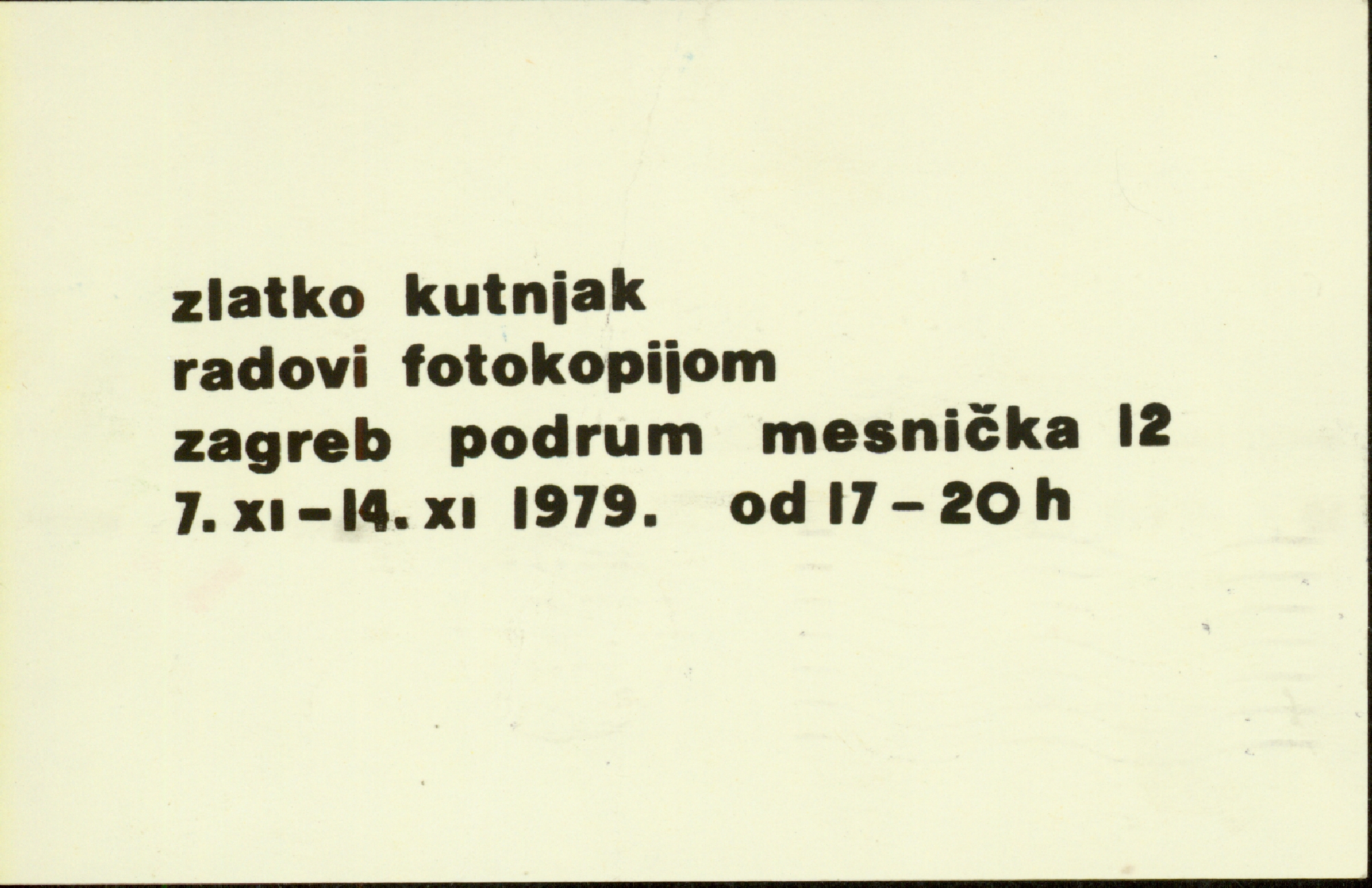 pozivnica za izložbu Zlatka Kutnjaka "Radovi fotokopijom" u Podroom, Mesnička 12, Zagreb