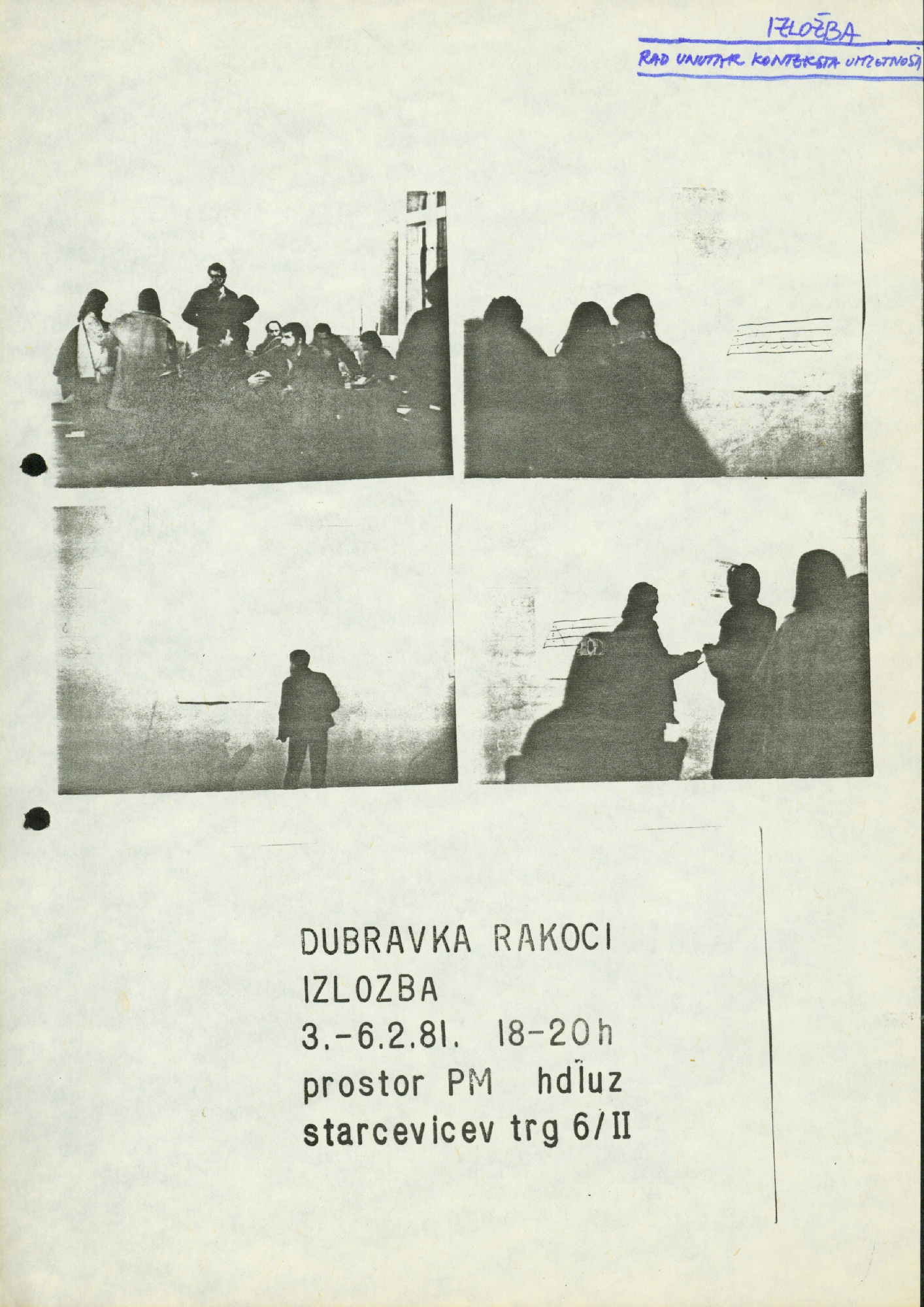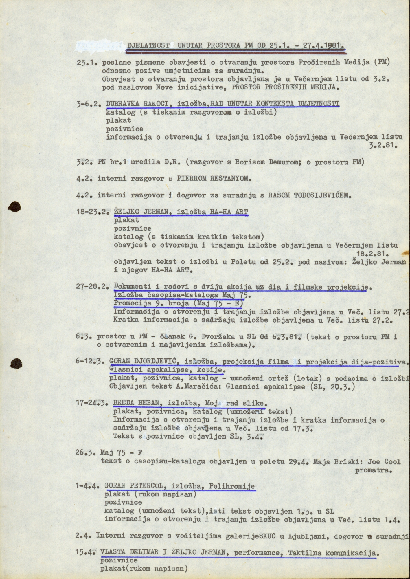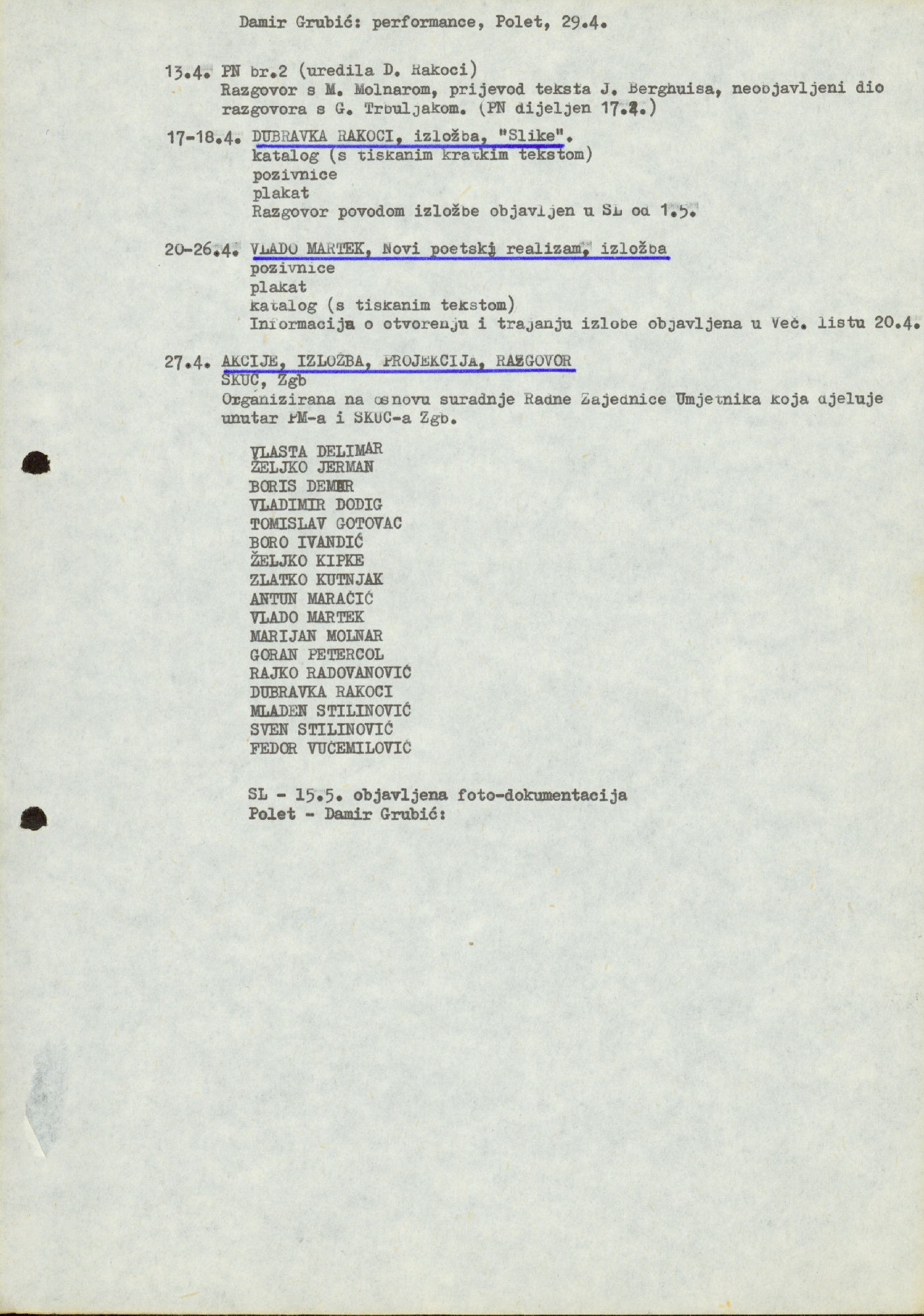 događaji u PM; Dubravka Rakoci, Boris Demur, Pierr Restany, Raša Todosijević, Željko Jerman, Goran Djordjević, Breda Beban, Antun Maračić, Maja Briski, Goran Petercol, Vlasta Delimar