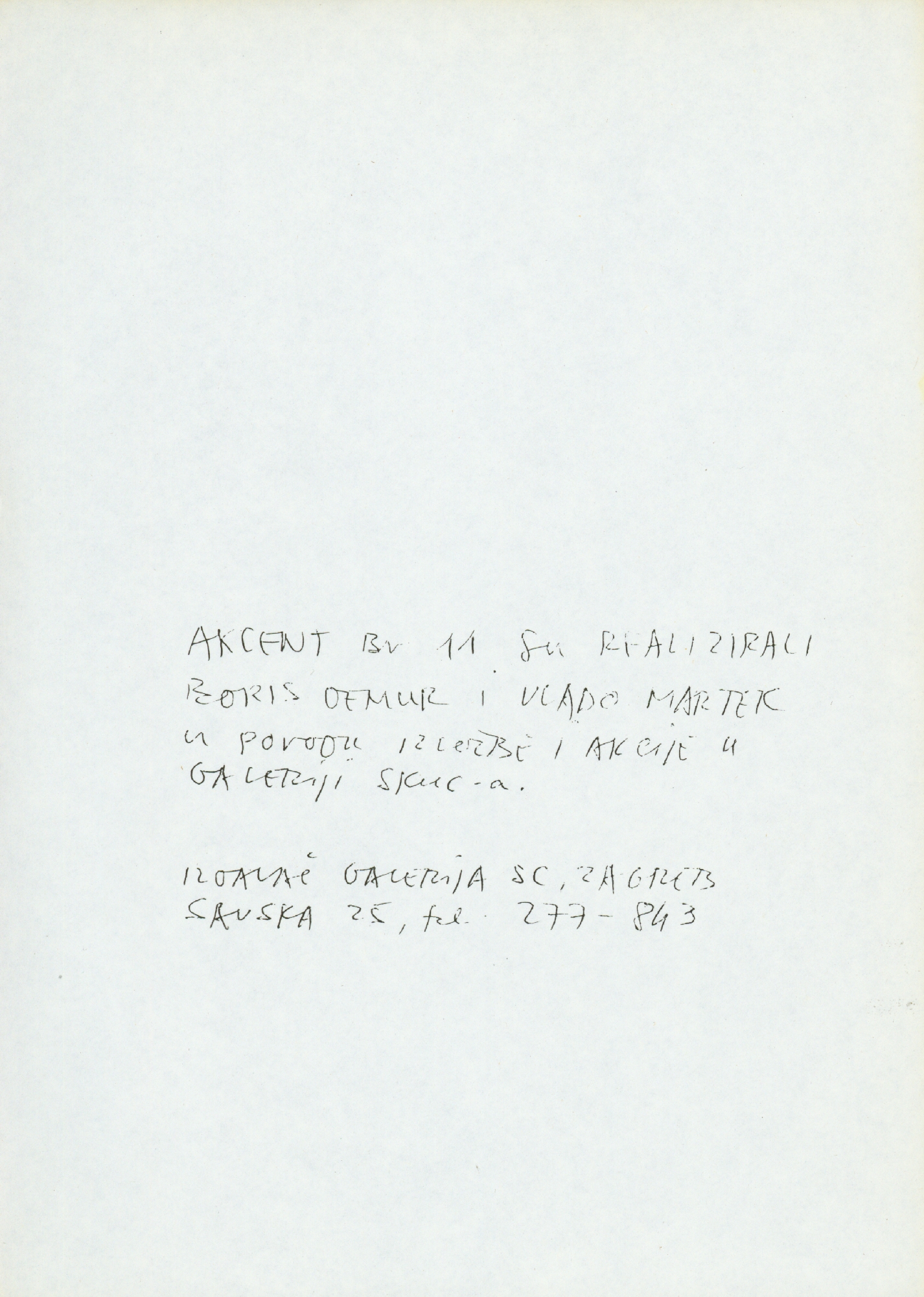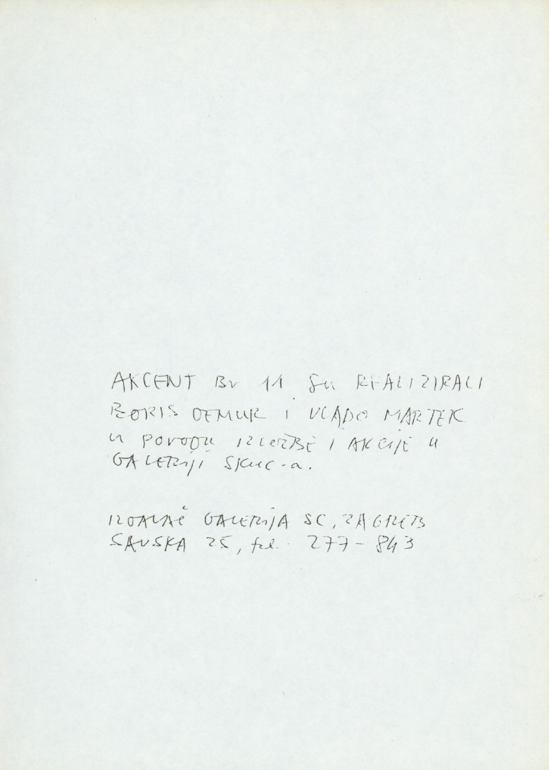 Akcent, broj 11, izdavač: Galerija studentskog centra, Savska 23, 41000 Zagreb; izdanje realizirali Boris Demur i Vlado Martek u povodu izložbe i akcije u Galeriji SC