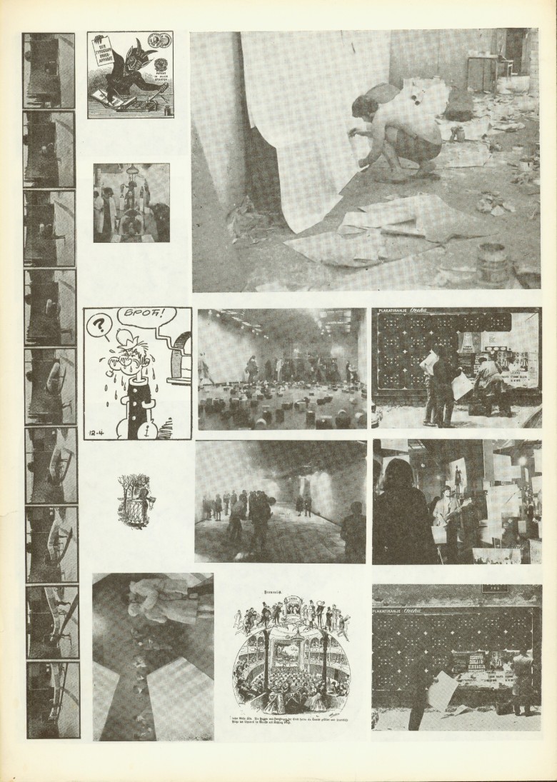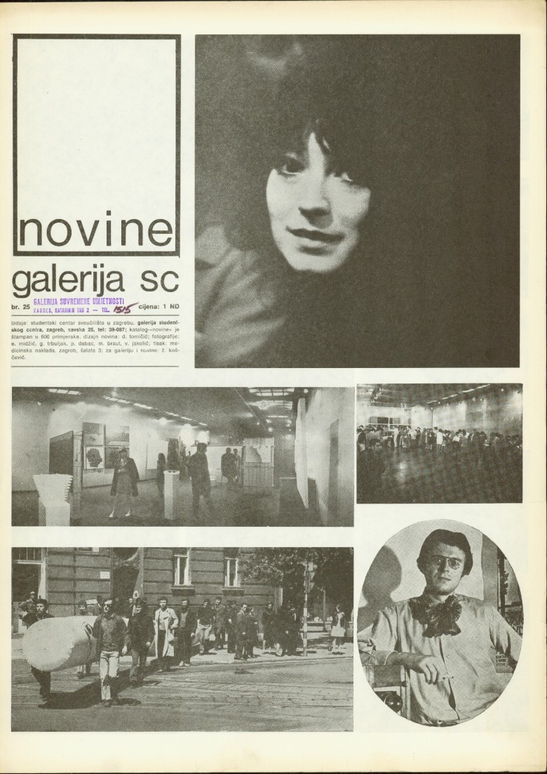 price 1 ND; University Student Centre, Student Centre Gallery, Zagreb, Savska 25; newspaper: D. Tomičić; photographs by E. Midžić, G. Trbuljak, P. Dabac, M. Braut, V. Jakolić; 600 copies of catalogue -newspaper printed; press: Medicinska naklada, Zagreb, Šalata 3; for gallery and catalogue : Želimir Koščević;