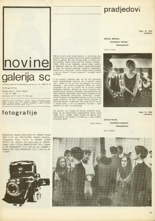 University Student centre, Student Centre Gallery, Zagreb, Savska 25; poster: B. Bućan; catalogue ue: D. Tomičić; photography: P. Dabac, M. Braut; 500 copies printed; press: Medicinska naklada, Zagreb, Šalata 3; Biljana Tomić, Želimir Koščević