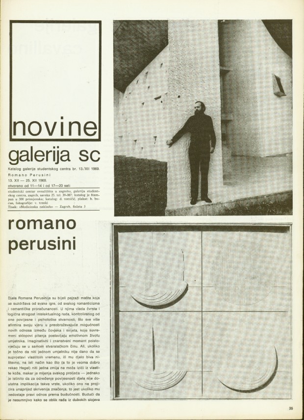 University Student Centre, Student Centre Gallery, Zagreb, Savska 25; poster: B. Bućan, catalogue ue: D. Tomičić; photography: V. Trnski; 500 copies printed; press: Medicinska naklada, Zagreb, Šalata 3; Romano Perusini, Silvio branzi, about gallery Cavallino
