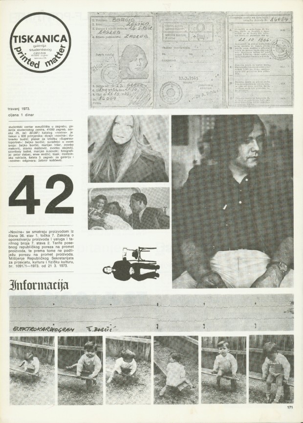 price 1 ND; newspaper published by: Student Centre Gallery, Zagreb, Savska 25, University Student Centre in Zagreb; newspaper design: Dubravko Budić; poster for the exhibiton "Superautoportret": Željko Borčić; photography: P. Dabac, E. Midžić; 600 copies of the newspaper printed; press: Medicinska naklada, Zagreb, Šalata 3; responsible for newspaper and gallery : Želimir Koščević; collaborators: Balint Szombathy, Zvonko Maković, Željko Borčić, Marijan Tršar, Slavko Matković, Marijan Susovski; Zvonko Stojević, Land Art, rasponi 73, Jorge Glusberg, Milomir Milo Jevtić