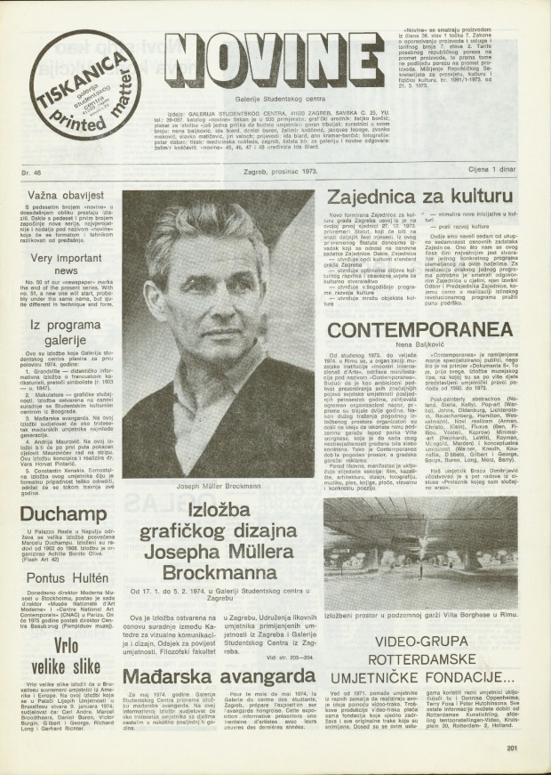 price 1 dinar; publisher: Student Centre Gallery, Zagreb, Savska 25, University Student Centre in Zagreb; technical editor: Željko Borčić; poster for the exhibition "Još jedna prilika da budete umjetnik": Goran Trbuljak; photography: Petar Dabac, 600 copies printed; press: Medicinska naklada, Zagreb, Šalata 3; for newspaper and gallery: Želimir Koščević; collaborators: Nena Baljković, Ida Biard, Daniel Buren, Želimir Koščević, Jacques Lepage, Zvonko Maković, Slavko Matković, Jiri Valoch; translation: Ida Biard, Ann Kramer-Borčić; newspapers 45, 46, 47 and 48 edited by Ida Biard; Joseph Müller Brockmann, Marcel Duchamp, Vladimir Gudac, Miro Vuco, Davor Matičević, Roman Cieslewicz, Ben Vautier