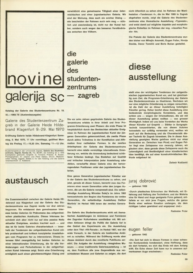 Edition in German language; University Student Centre, Student Centre Gallery, Zagreb, Savska 25; poster: B. Bućan, catalogue ue: D. Tomičić; photography: Vl. Jakolić, P. Dabac; 1000 copies printed; press: Medicinska naklada, Zagreb, Šalata 3; for the gallery and catalogue ue: Želimir Koščević; Radoslav Putar, Juraj Dobrović, Eugen Feller, Mladen Galić, Dubravko Horvatić, Ante Kuduz, Ivan Picelj, Ješa Denegri, Aleksandar Srnec, Andrija Mutnjaković, Ljerka Šibenik, Miroslav Šutej, Vera Horvat Pinatrić, Petar Dabac, Marija Braut, Slobodan Dimitrijević, Dalibor Martinis, Fedor Kritovac, Zlatko Bastašić, Ivo Šarić, Dejan Jokanović, Janez Segolin, Zmago Jeraj, Sanja Iveković, Gorki Žuvela