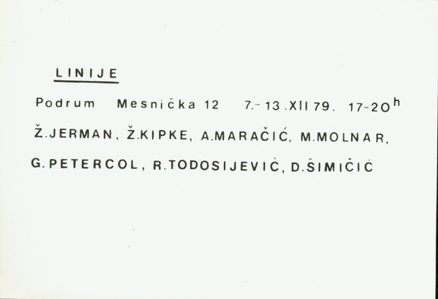 invitation for the exhibition "Linije" in Podroom, Mesnička 12, Zagreb; Željko Kipke, Željko Jerman, Antun Maračić, Marijan Molnar, Goran Petrecol, Raša Todosijević, Darko Šimičić