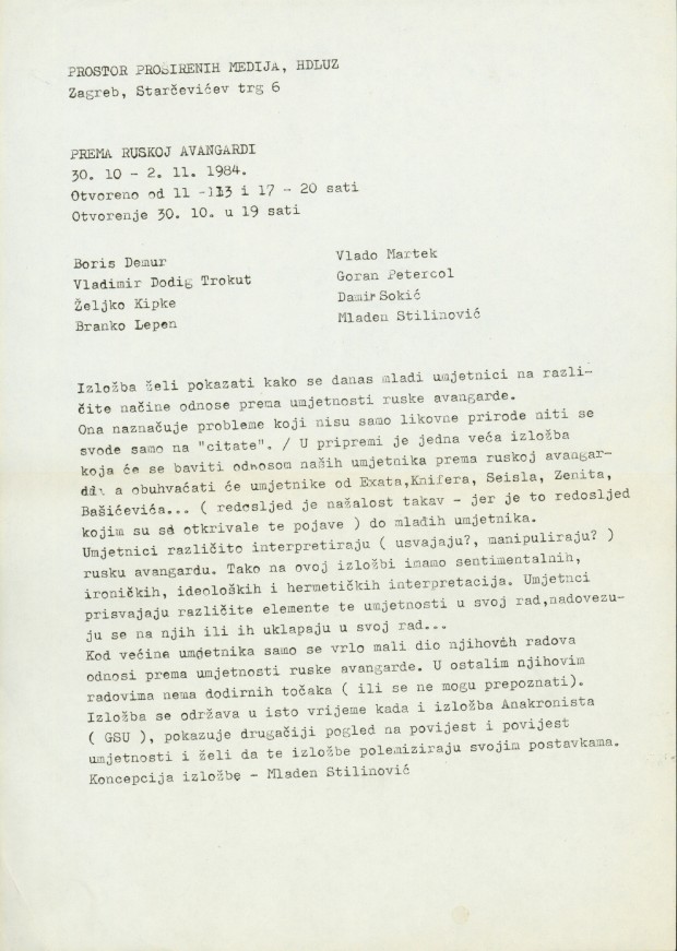 flyer for the exhibition "Prema ruskoj avangardi"; conception and text by Mladen Stilinović; artists: Boris Demur, Goran Petercol, Vladimir Dodig Trokut, Željko Kipke, Boris Lepen, Vlado Martek, Damir Sokić, Mladen Stilinović
