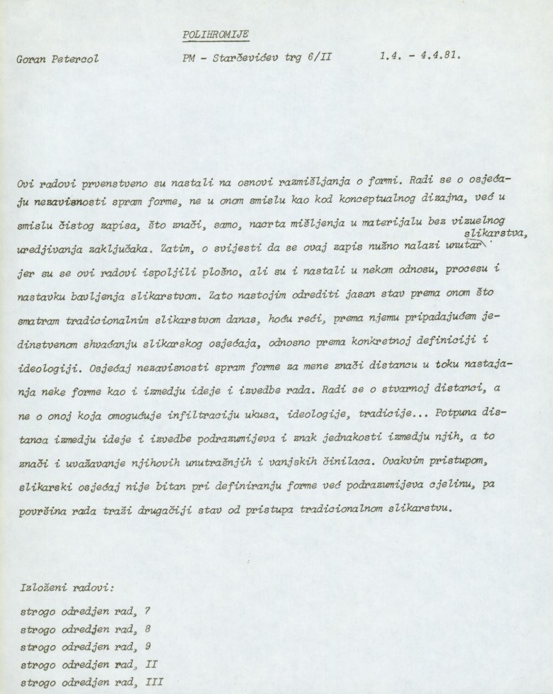 flyer of the exhibition "Polikromije" by Goran Petercol in PM